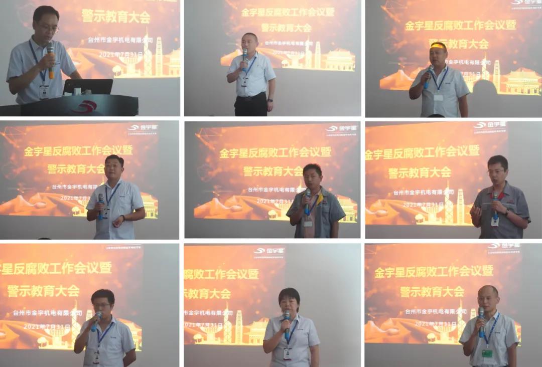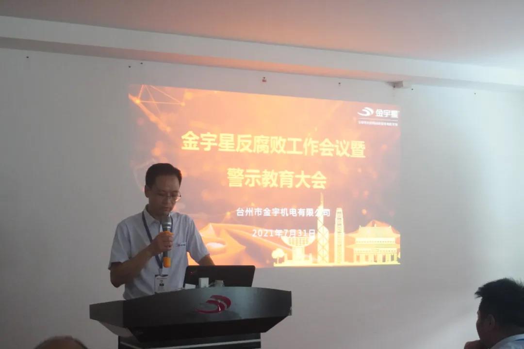 7月31日下午,為進一步貫徹落實公司反腐敗、反賄賂工作的部署,營造風清氣正的發展環境,堅定不移地推動反腐敗和廉潔自律工作向縱深發展,金宇星在黃巖總部召開了反腐敗工作會議暨警示教育大會,全體管理人員及關鍵核心崗位120余人參加,董事長王加許發表了重要講話并明確指示,對腐敗實行零容忍,任何人都不允許觸及此高壓線,會議分為四個議程展開。